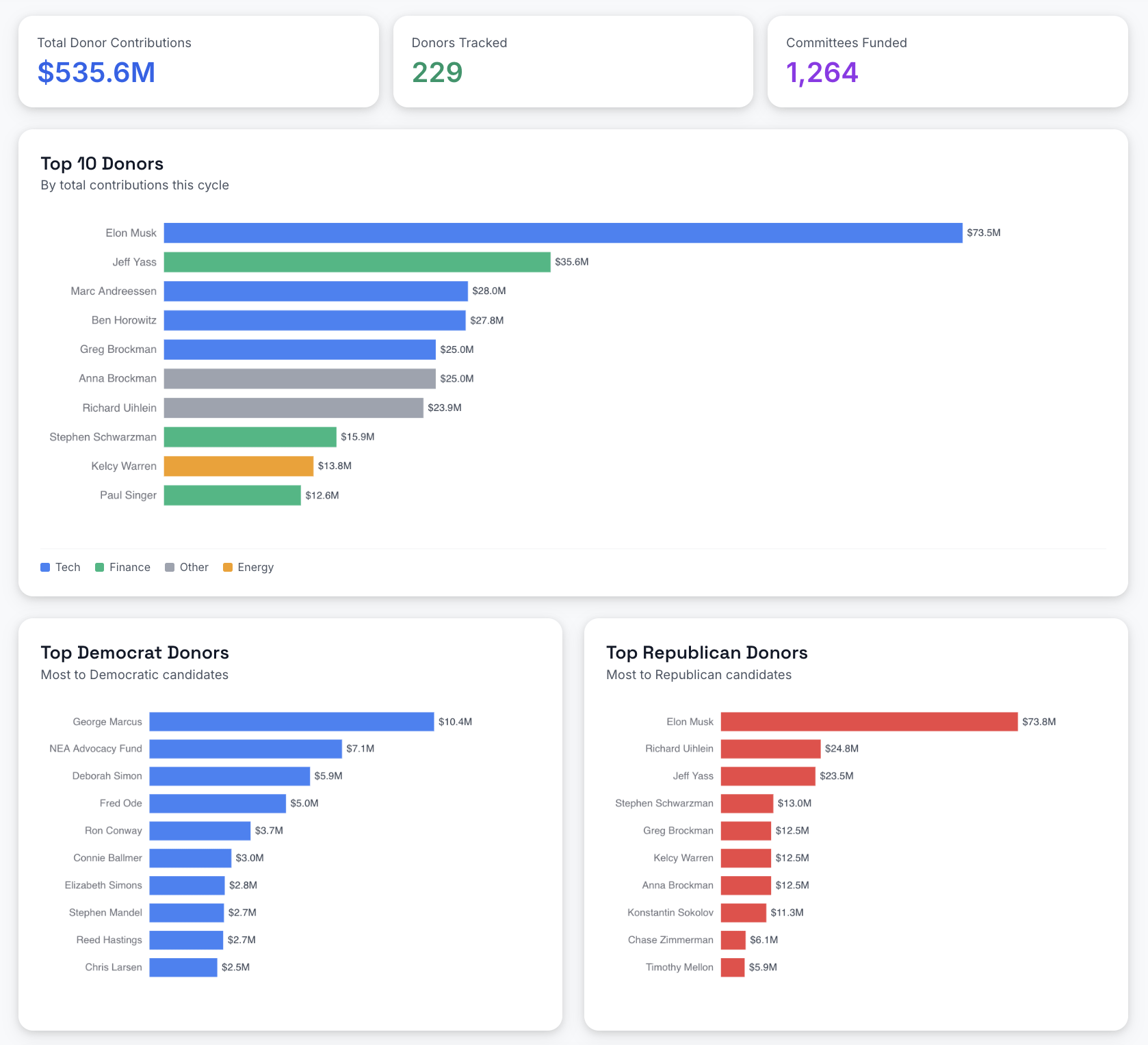 To be honest, I’d rather just have a graph with the top 10-20 donors labeled by who they donated to graph rather than these 3, as that would make it way easier to visually compare. I’d also prefer company names to industry labels, as people probably know what industry major companies are in, but they are less likely to know who owns what company.