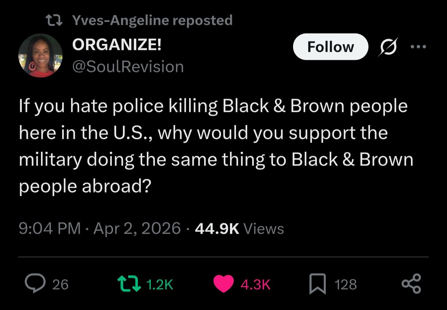 Good thing I don’t? In general the people who are more upset about police brutality are the same people who are more upset about the imperial use of our military.
