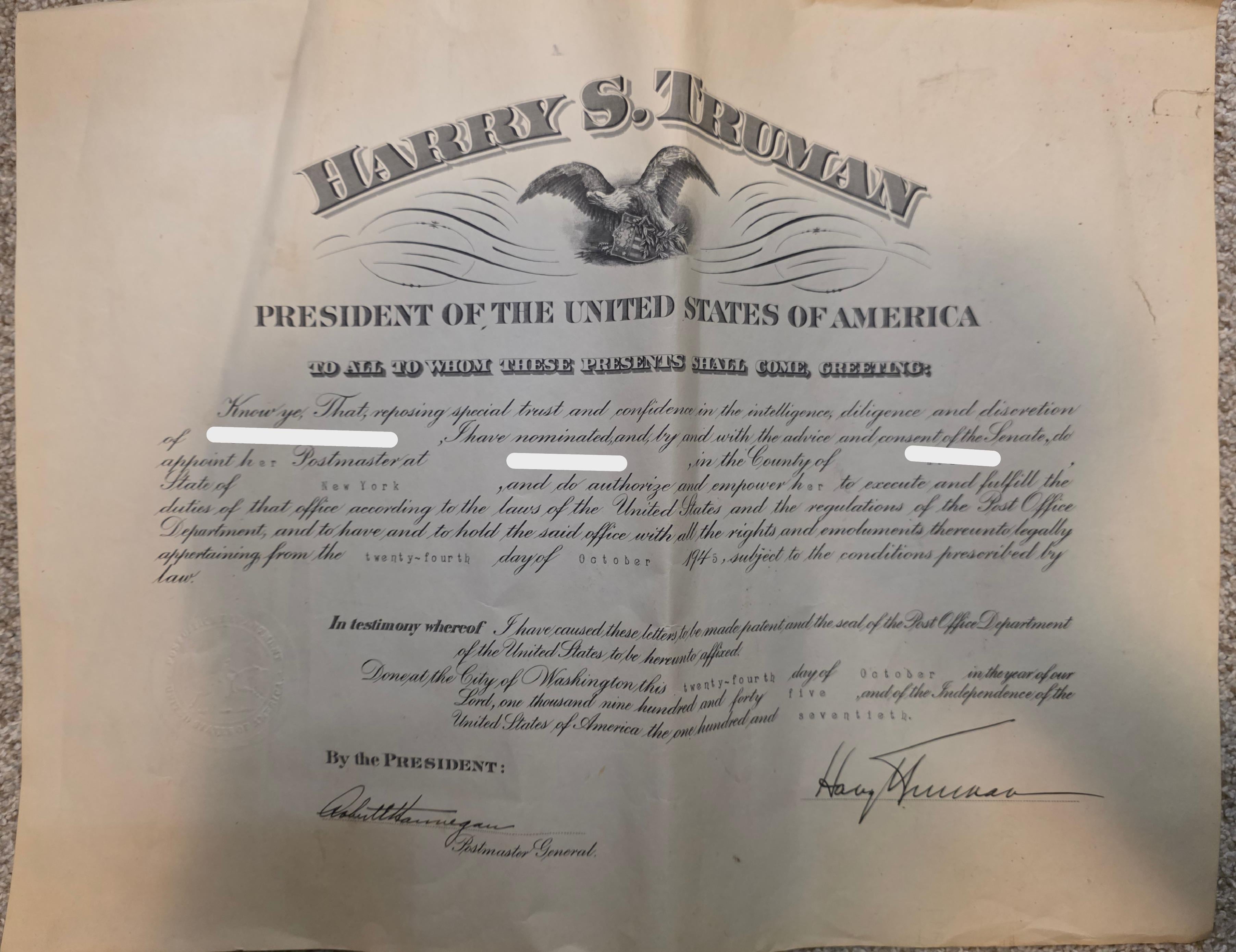 My Great-Grandmother, my Great-Aunt, and my Grandmother were all appointed Postmaster of our small village in NY at their respective points in time. Here, i found the appointment document for my Great-Grandmother signed by Harry Truman himself, 1945.