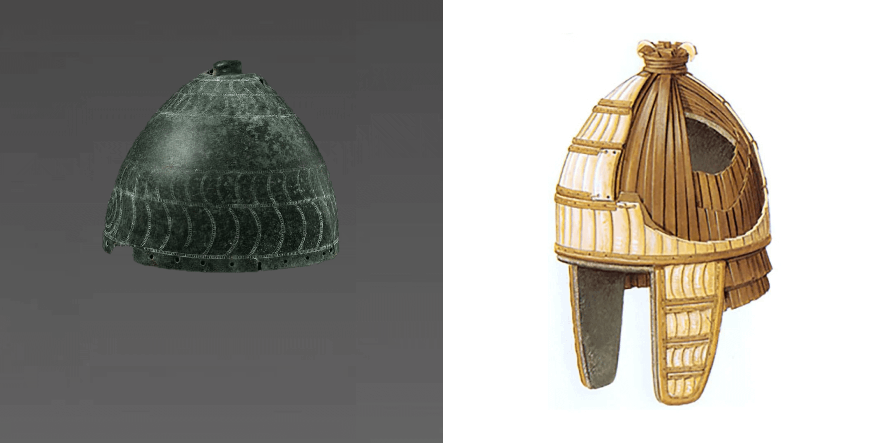 Skeuomorphic Mycenaean bronze helmet (left) that mimicks older, more traditional helmets (right) by having punched rows of boar’s tusks and a spool-shaped socket at the top, used in older helmets to tie the leather straps together. 1400-1300 BCE. Displayed at Ashmolean Museum, Oxford. [1776×888]