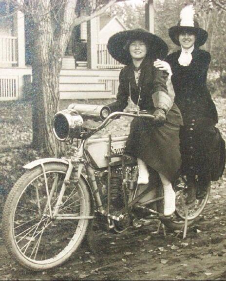 Two beautiful flamboyant women on a 1914 Sears deluxe dreadnought motorcycle. It was sold during this time in the Sears catalog. Roughly sold for about $250.