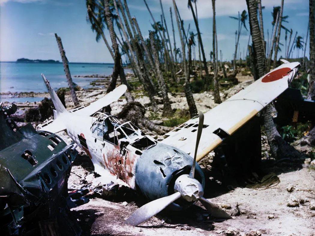 Wreck of a Japanese Mitsubishi A6M3 Zero (T2-157) fighter aircraft – from the Imperial Japanese Navy Air Service – at Munda Airfield, New Georgia, Solomon Islands), c. September 1943. [1050 x 788]