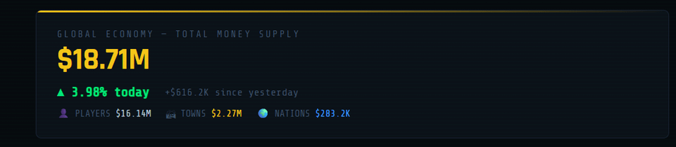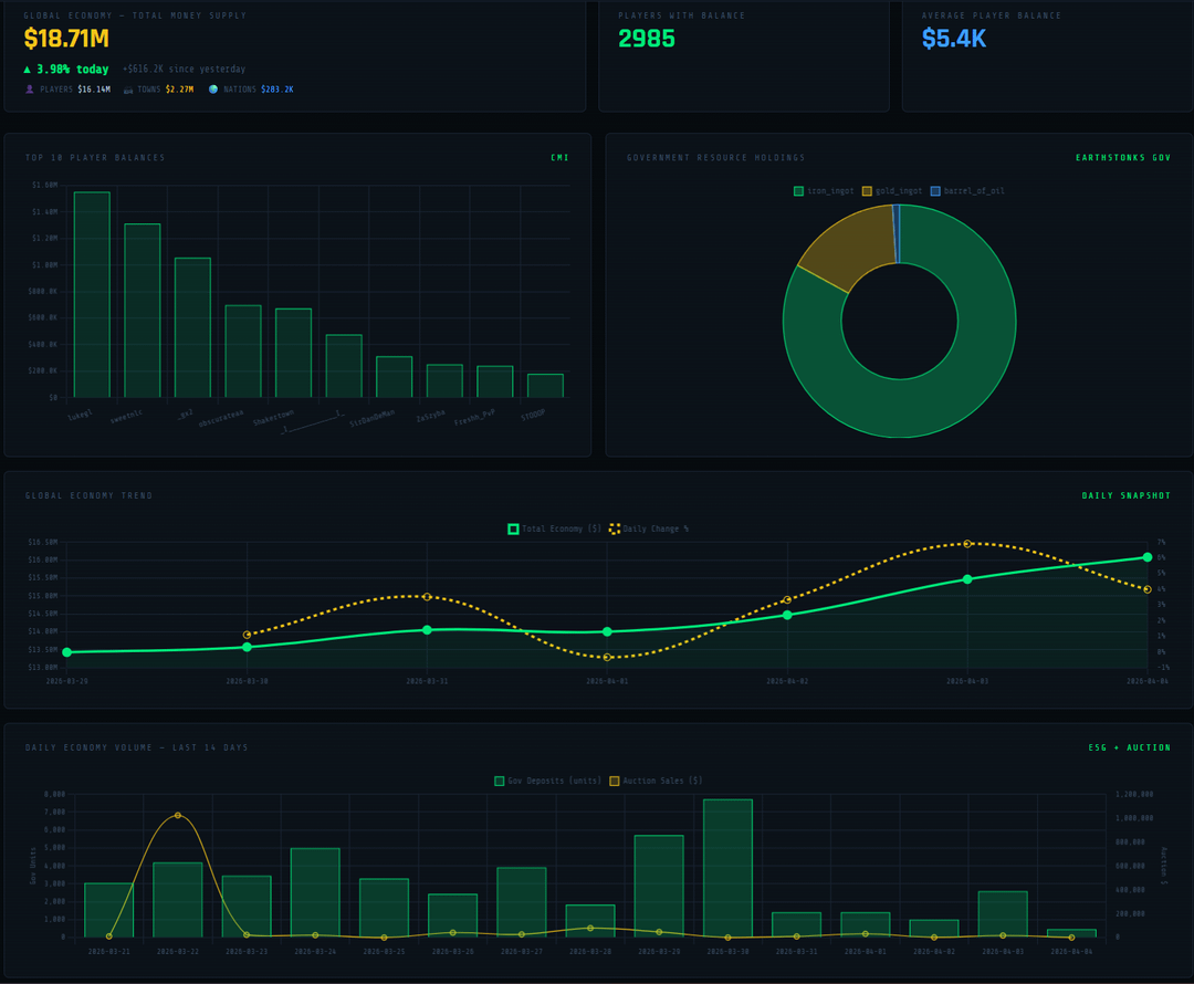 ijohnwickedthat on April 4, 2026 9:56 am Data source: live player/town/nation economy on EarthStonks Minecraft server. Built with PHP/MySQL. Live dashboard at [stonksmc.com/stats](http://stonksmc.com/stats)