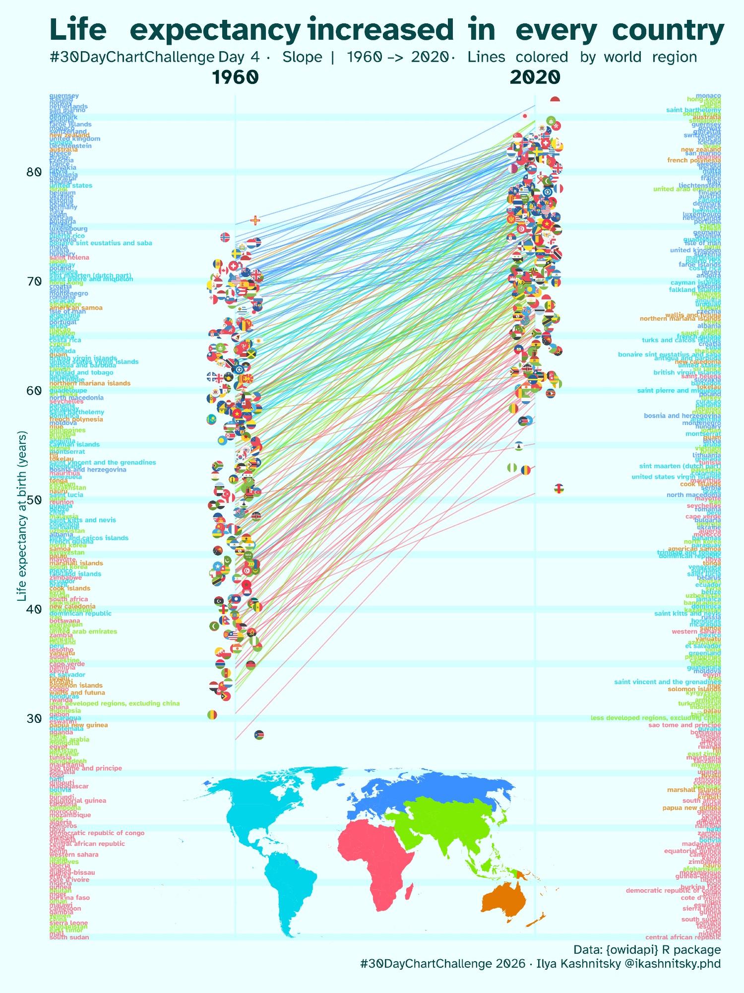 [OC] This is probably the most important development for humans in the recent history — the tremendous growth of life expectancy across all countries 🌐