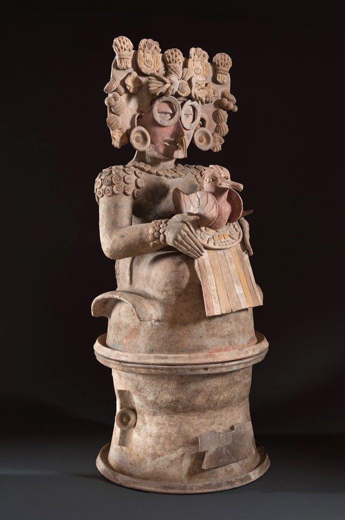 A ceramic incense burner with lid, in the Teotihuacan style. The lid depicts a woman, or female deity, seated and holding a water bird on her lap. From Guatemala, 150/200-650 CE [680×1024]