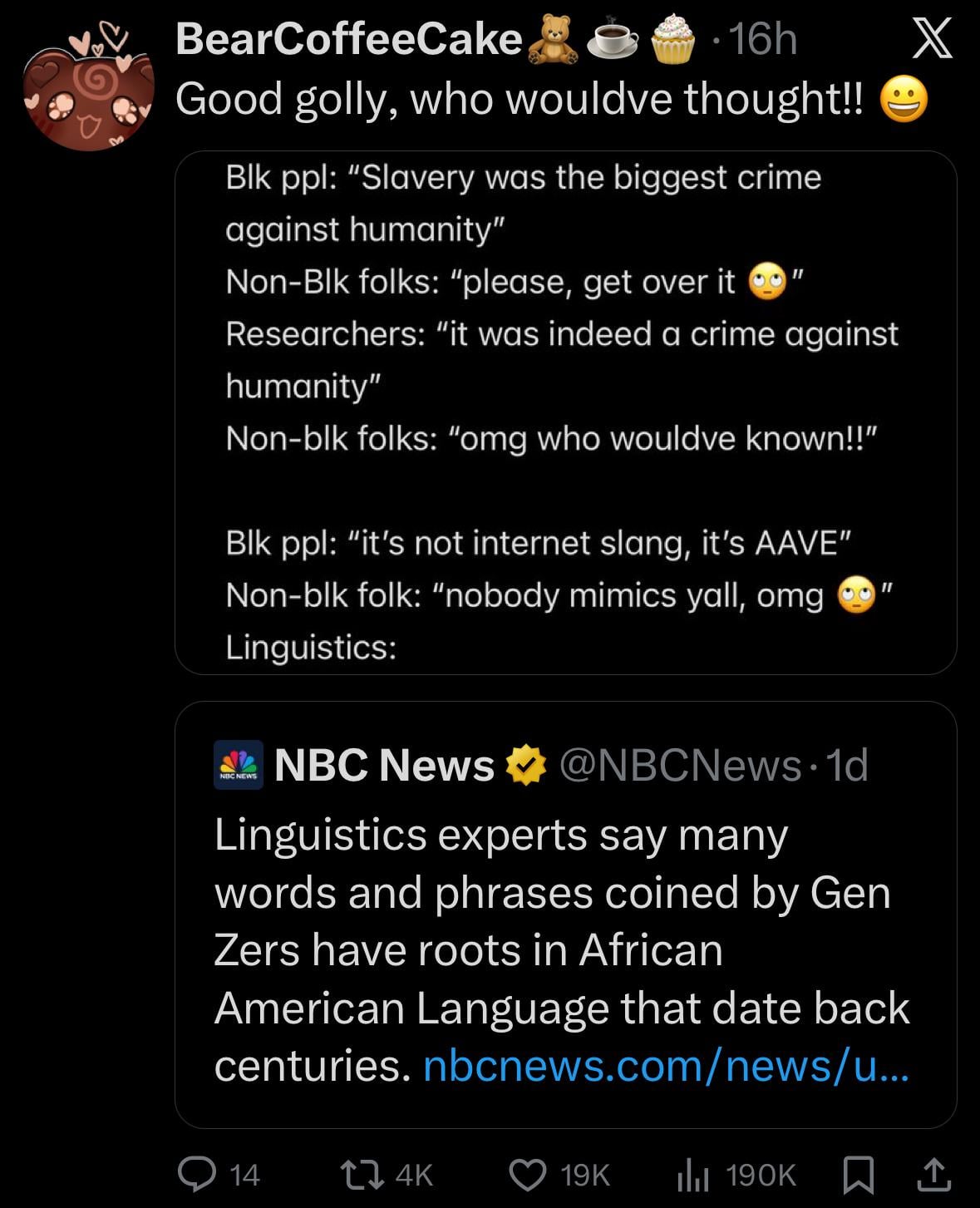 i posted a comment under the video with ryan gosling utilizing “gen z slang” to communicate to another person as promotion for something on here. i corrected it that it was AAVE and got downvoted. white people will never beat the racist “allegations”.