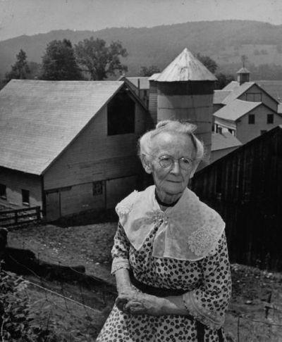 Legendary American folk artist Grandma Moses poses on her farm, circa 1950s but exact date unknown. She started her remarkable painting career at 78 years old, and became friends with Norman Rockwell.