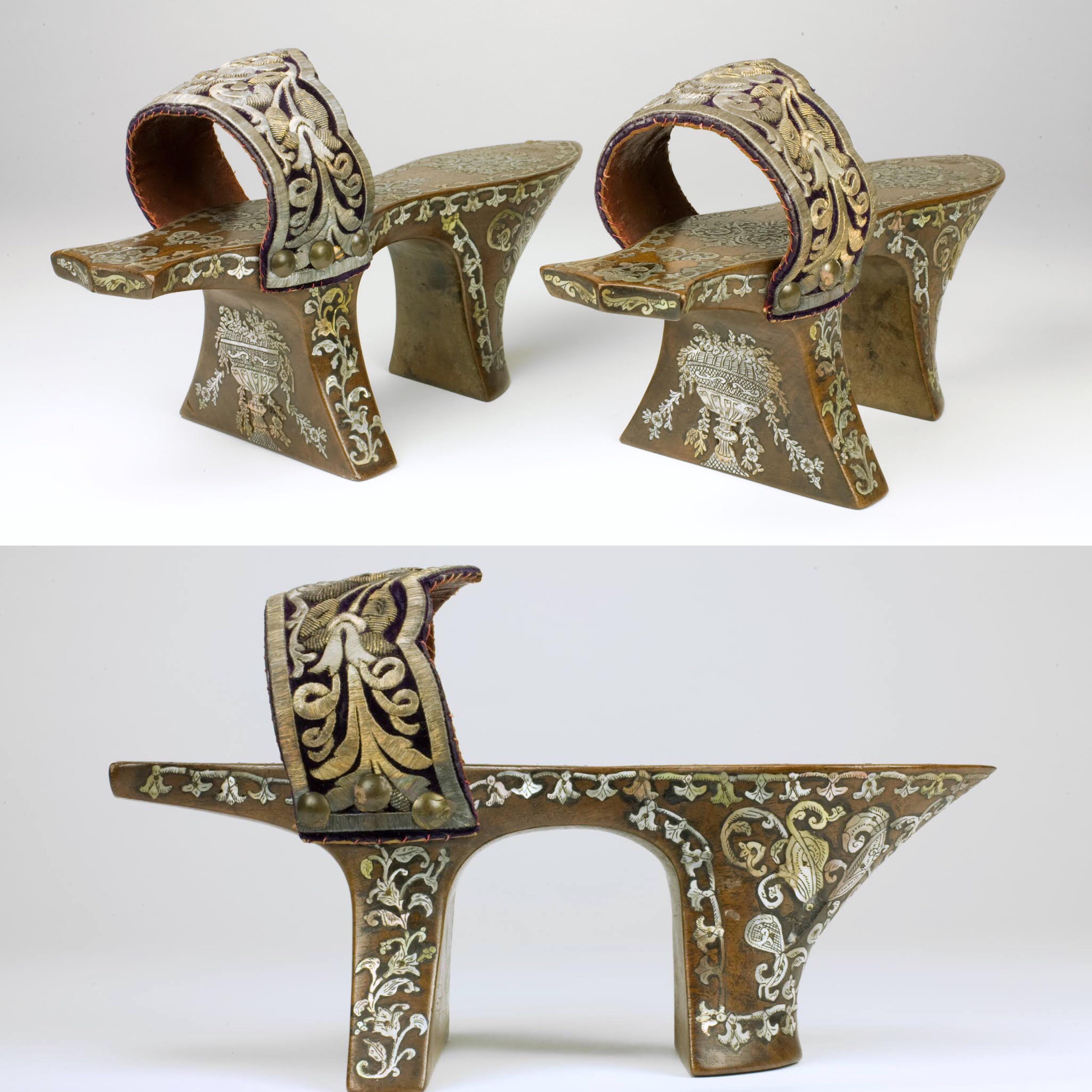 Ottoman Turkish brides traditionally bathed at the hammam or Turkish bath before their weddings. The accoutrements required for the hammam included Turkish towels, a bowl for pouring water, and a pair of nalin. For weddings, wealthy brides were frequently gifted with elaborately decorated nalin similar to this pair.