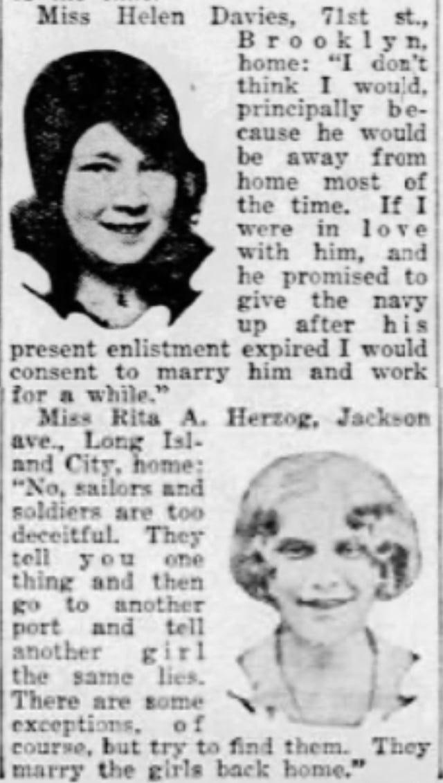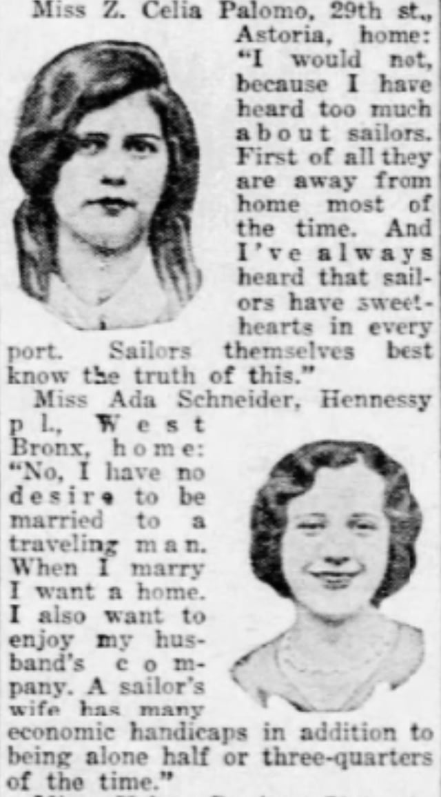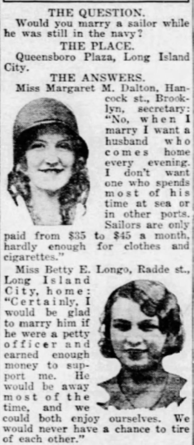 Inquiring Photographer:”Would you marry a sailor while he was still in the navy?”February 18, 1930.