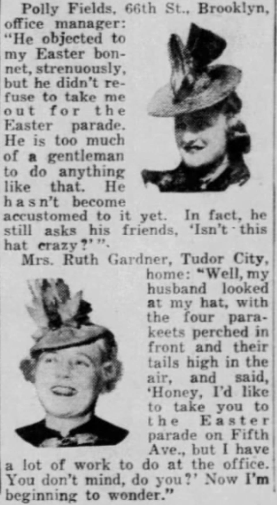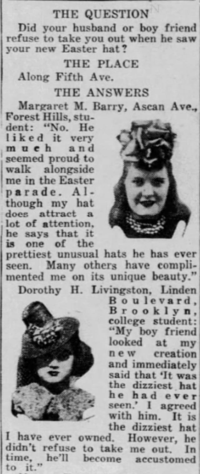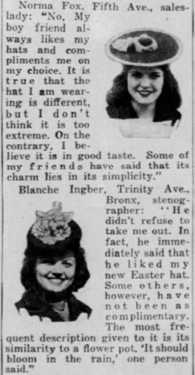 Inquiring Photographer: “Did your husband or boy friend refuse to take you out when he saw your new Easter hat?”Apr 18, 1939 by CryptographerKey2847