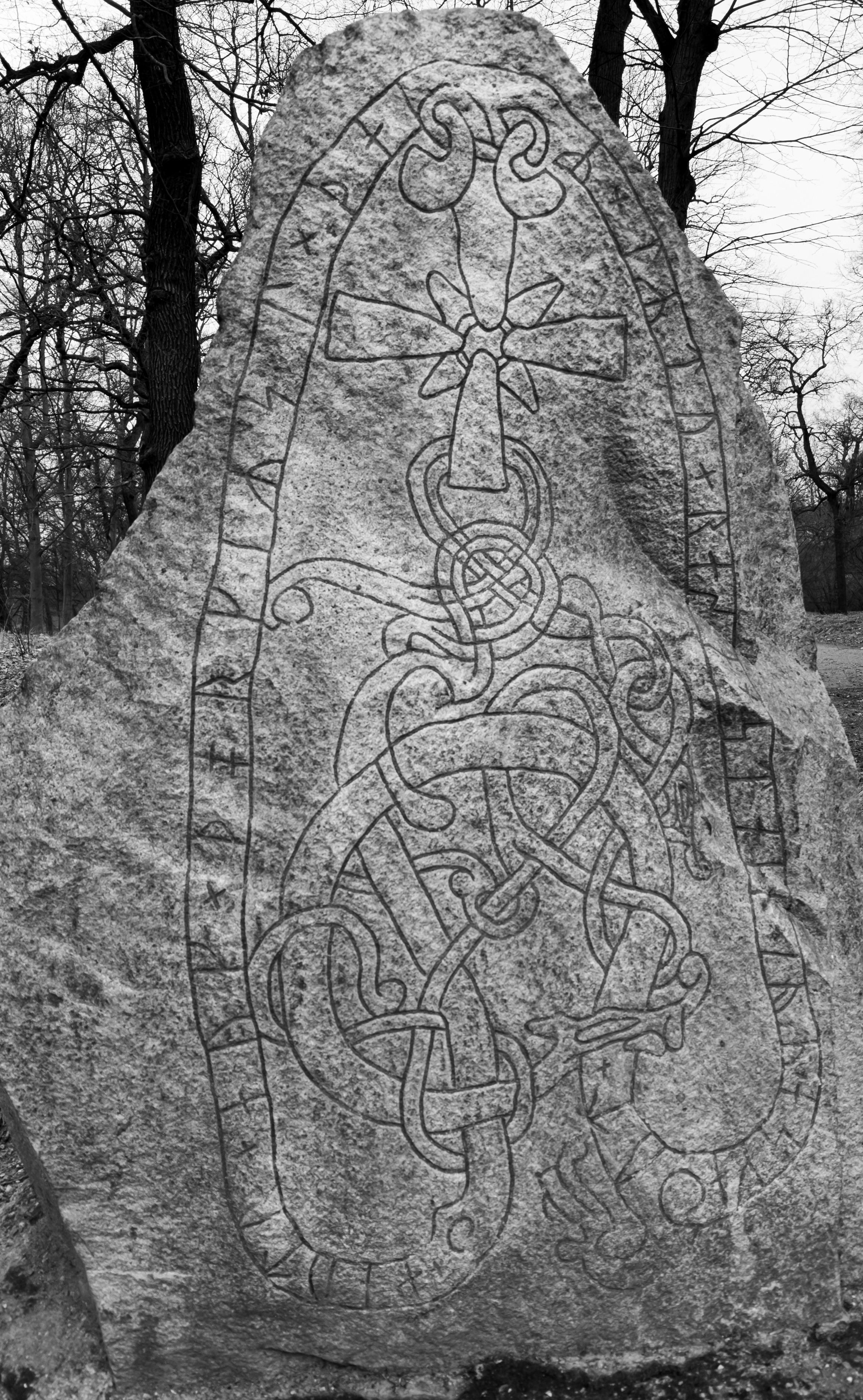 Careful now this runestone has been gossiping about people for a thousand years and it never forgets a name carved into that looping serpent [2322×3766] (Upplands runinskrifter 124; Urnes style, Karlberg Castle, Stockholm)
