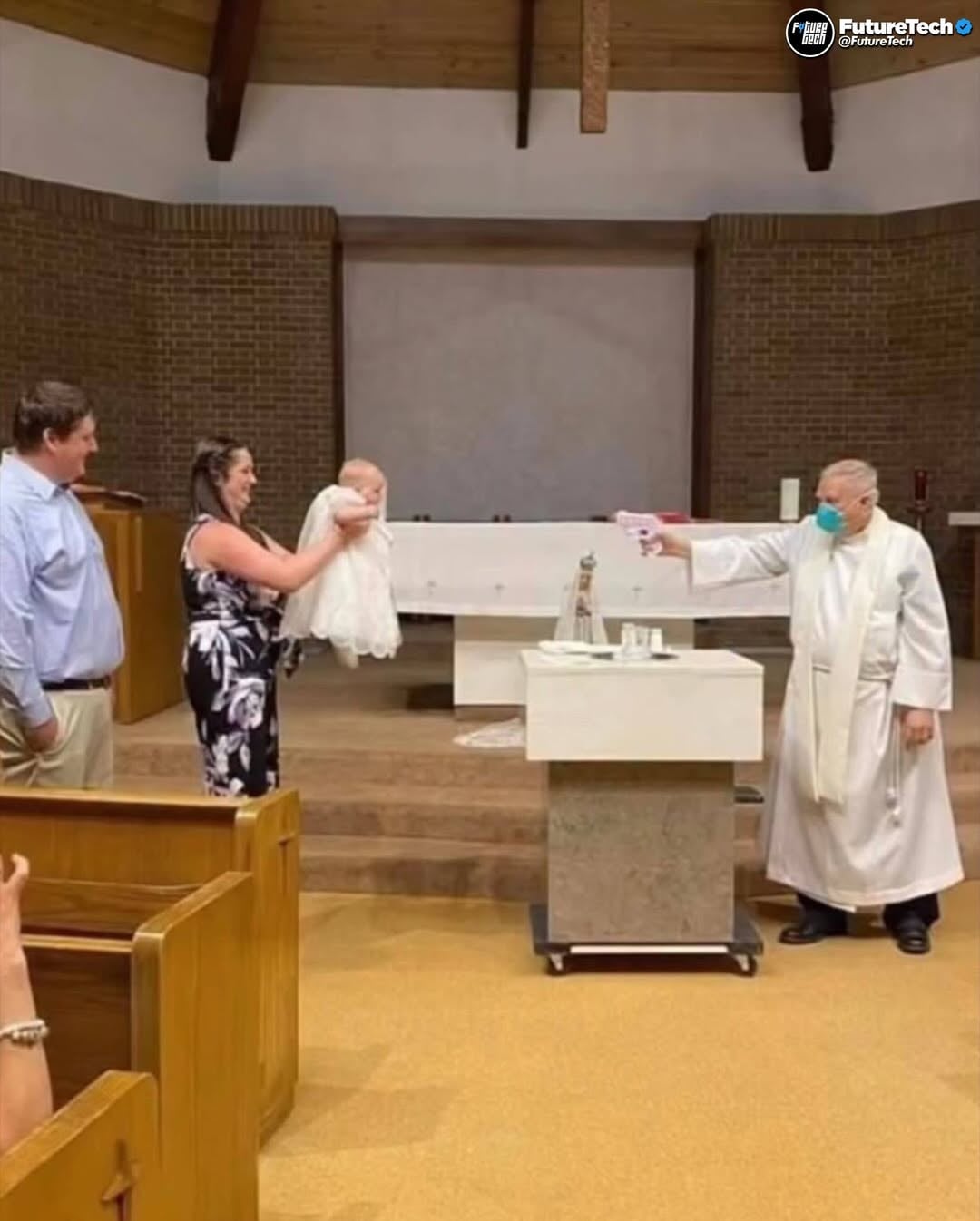 I absolutely love the picture of the priest firing a water pistol at a baby
