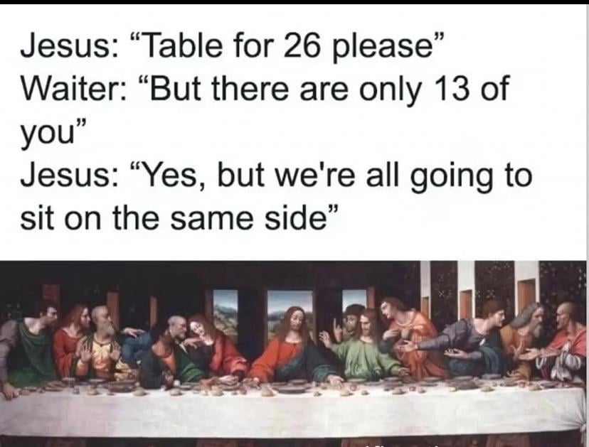 Waiter: ‘Sir, the other side of the table is literally right there.’ Jesus: ‘I know, but we’re expecting a painter.’