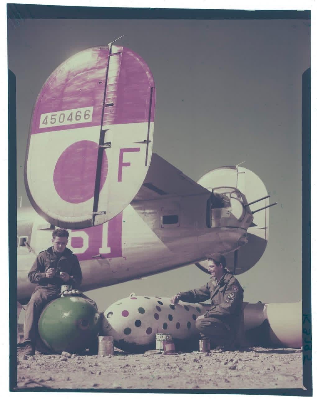 “Coloring Eggs That Will Go To Hitler. Sgt Herbert C. Wise of Bedford, Ky, left, and MSgt Tully D. Carr of Paul, Idaho, ordnance men of a MAAF B-24 gp, set to work with paint and brush to design ‘Easter Specials’ out of blockbusters.” Easter, 1945. [1020×1286]