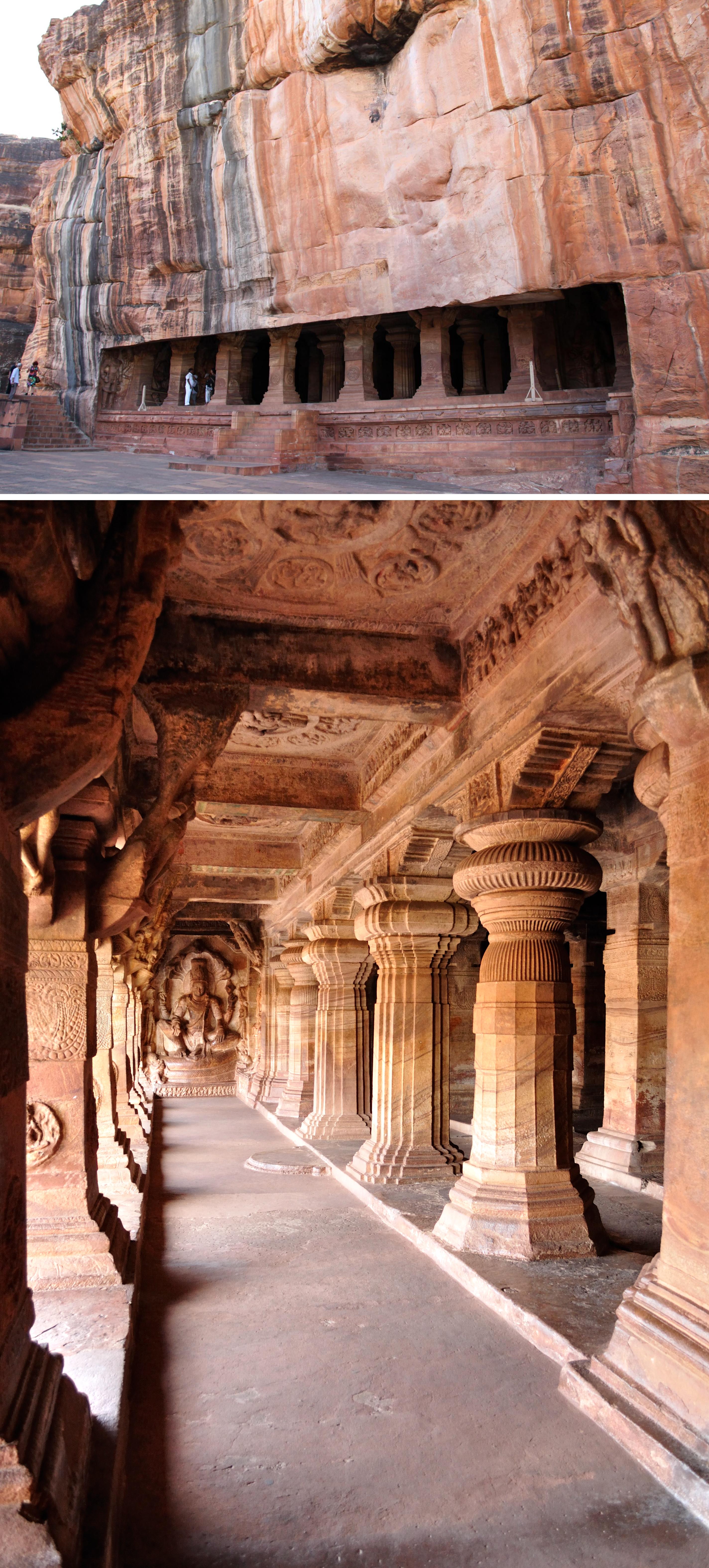 Badami Cave Temple 3 is the largest, oldest (dated 578 CE), and most ornate of the four rock-cut temples in Badami, India. It has intricately carved friezes and giant figures of Trivikrama, Anantasayana, Vasudeva, Varaha, Harihara and Narasimha [2848×6296]