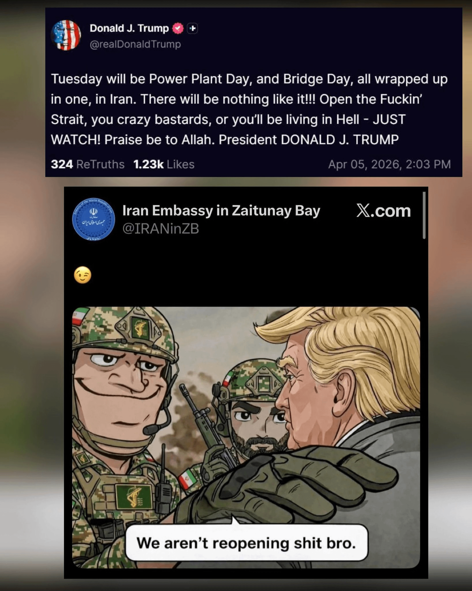 Iran trolling America in the middle of a war is so weird. I’m really thinking we’re living in some kind of TV show