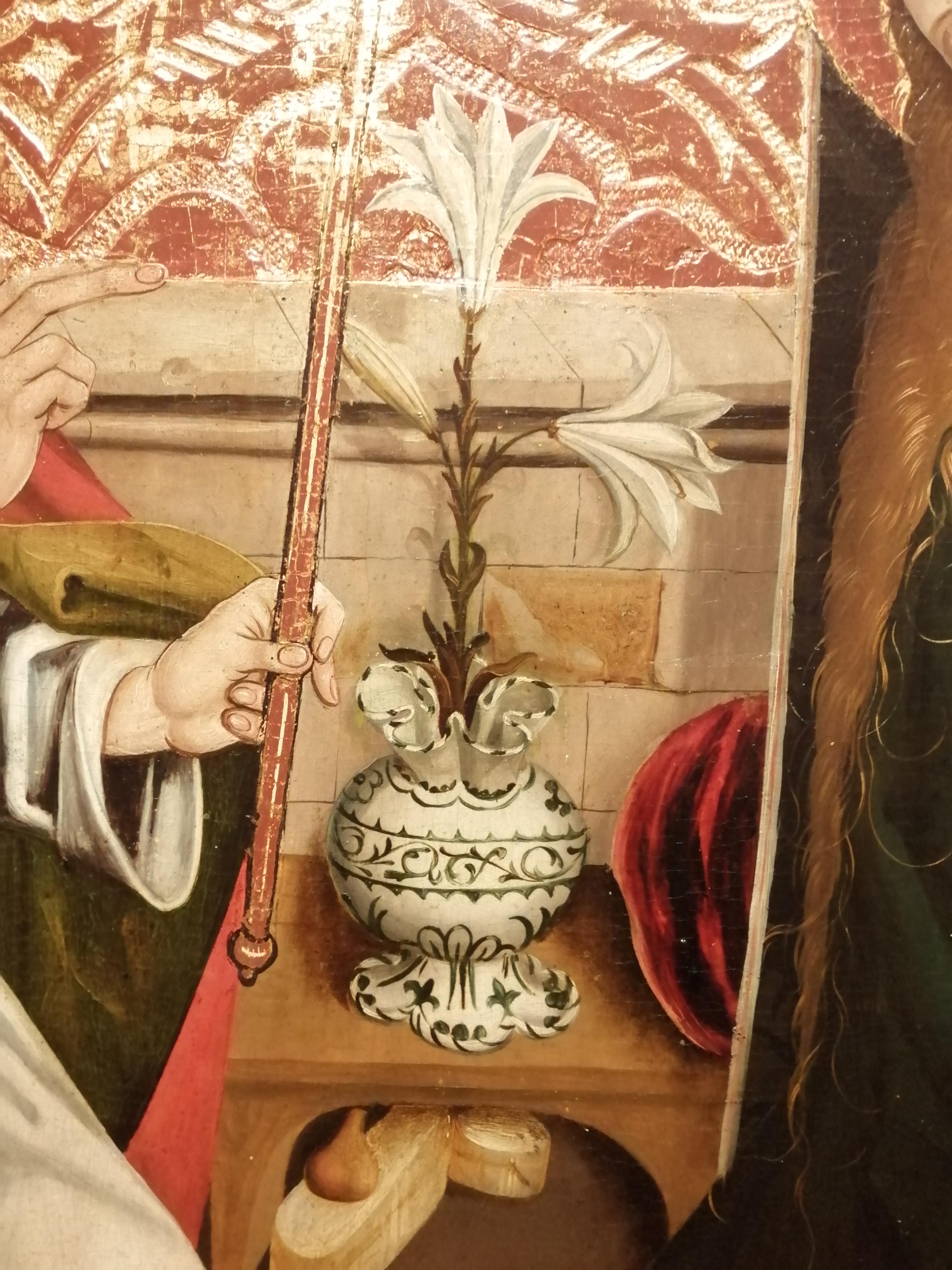 Incredible flower vase in a German painting from 1490. The ornament and the 5-pass opening have the shape of stylized lily blossoms, matching the actual flowers. Is anything like that preserved from the middle ages? [3120×4160]
