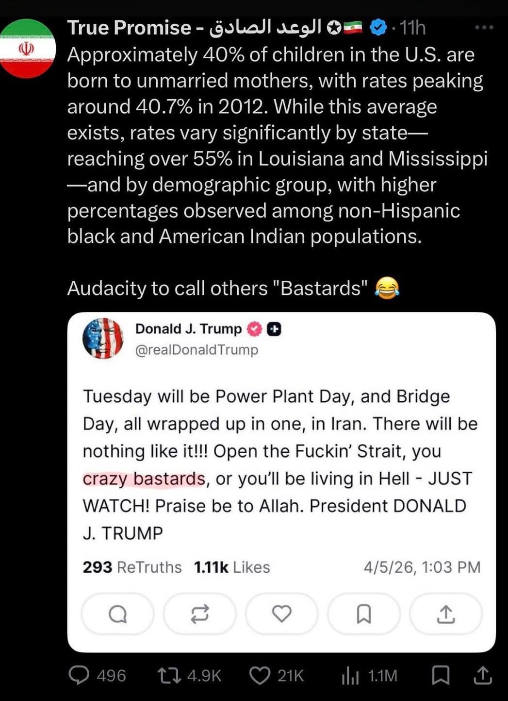 I like how this is a seen as a gotcha from Iran but if an american politician said this exact thing they’d be called both racist and weird for ‘wanting’ women to be married and have kids.