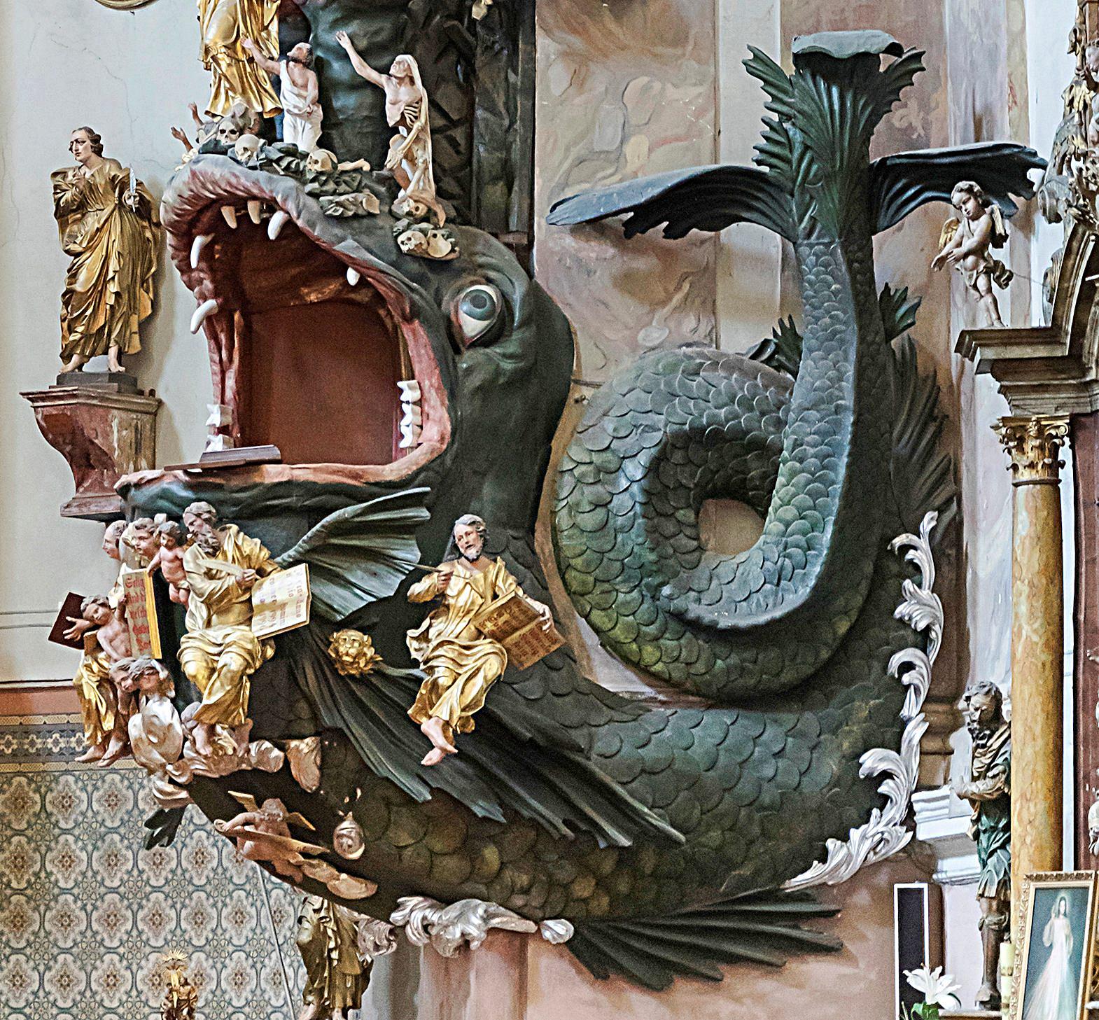 Baroque pulpit in a parish church in Duszniki-Zdrój, Poland. Created in 1730 by Michael Kössler, gilded and painted wood. [1570×1457]