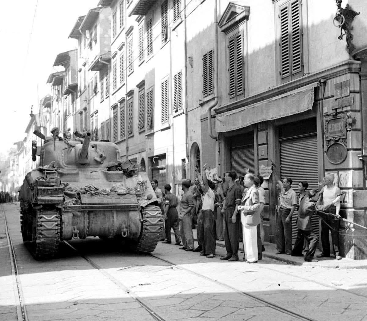 Italian partisans celebrate mid-shootout as a South African 6th Armoured Div. tank rolls forward to help deal with a German sniper’s nest. Florence, Italy, 4 October 1944. [1201×1050]