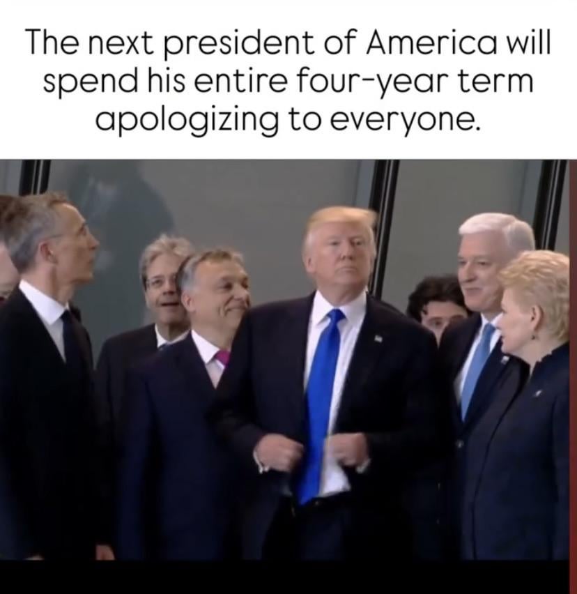 Bonus though – this meme, if you pull up the gif or video this still shot is from, he literally grabs one of the guys by the shoulder and shoves him out of the way so he can move out front and center, then stops, poses for the camera, puffs himself up, and does a dramatic jacket button like he is shooting an ad for his next reality show. He literally cannot control his own narcissism.