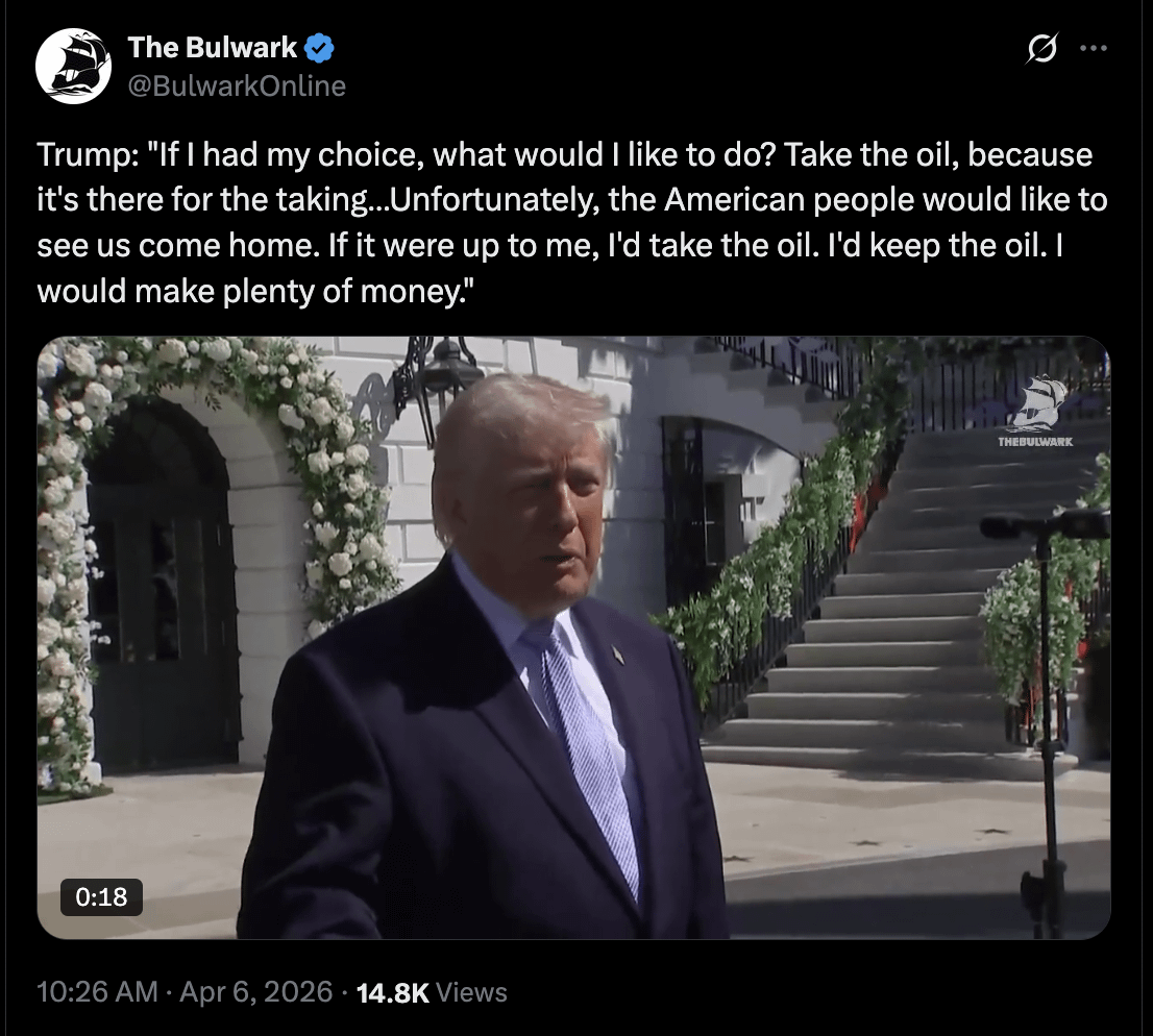 Trump: “If I had my choice, what would I like to do? Take the oil, because it’s there for the taking… Unfortunately, the American people would like to see us come home. If it were up to me, I’d take the oil. I’d keep the oil. I would make plenty of money.”