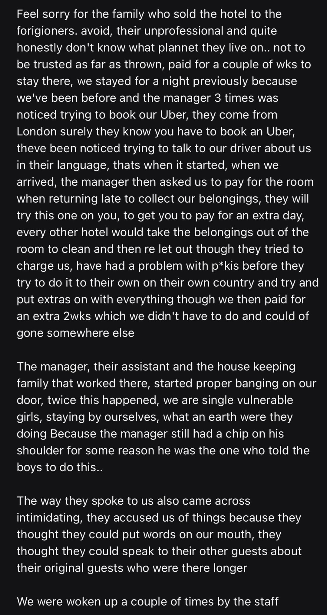 One thing I understood. They had their last night and in the morning left their luggage in the room while leaving for whatever to do. After returning late they went back to that room, had to be pulled out of it by constant knocking and demanding, and we’re charged with another day’s fee. And somehow it’s the owners fault.