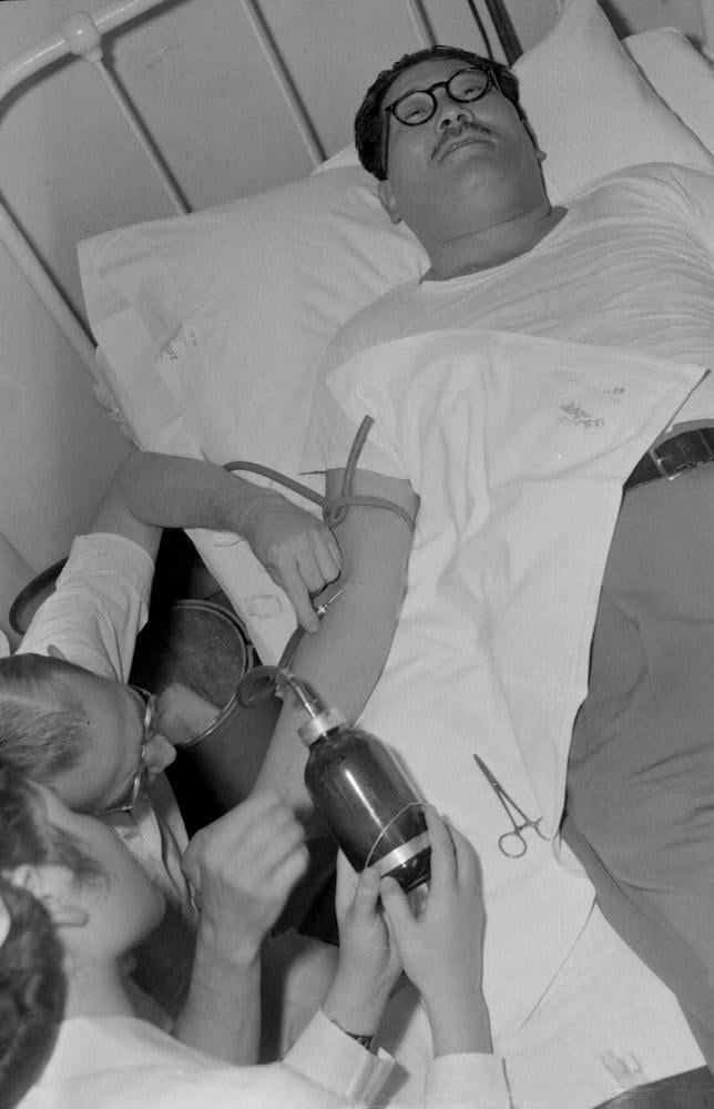 Inejirō Asanuma, Secretary-General of the Japan Socialist Party, participates in a public blood donation campaign in Tokyo to help wounded UN soldiers during the Korean War. 28 September 1950. (644×1000)