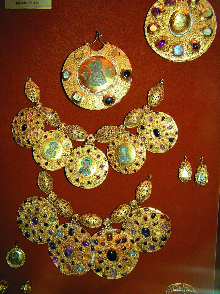 The “Ryazan Barmy treasure” discovered in 1822 in Ryazan, Russia. Made of gold, cloisonné enamel, precious stones, and pearls. 12th-13th century CE, now housed at Moscow Kremlin Museums [767×1024]