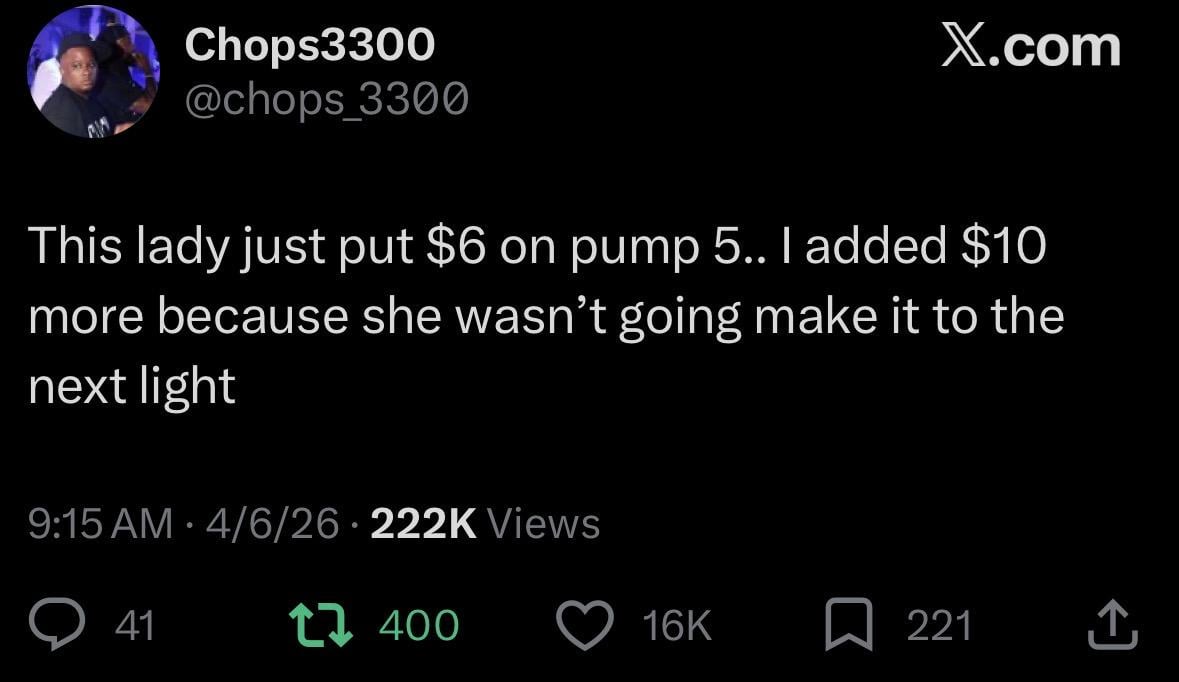 ShadyLogic on April 7, 2026 1:57 am Was he looking at her fuel gauge? I’ve put in $5 because I just needed enough to get to the gas station that’s 20¢/g cheaper.