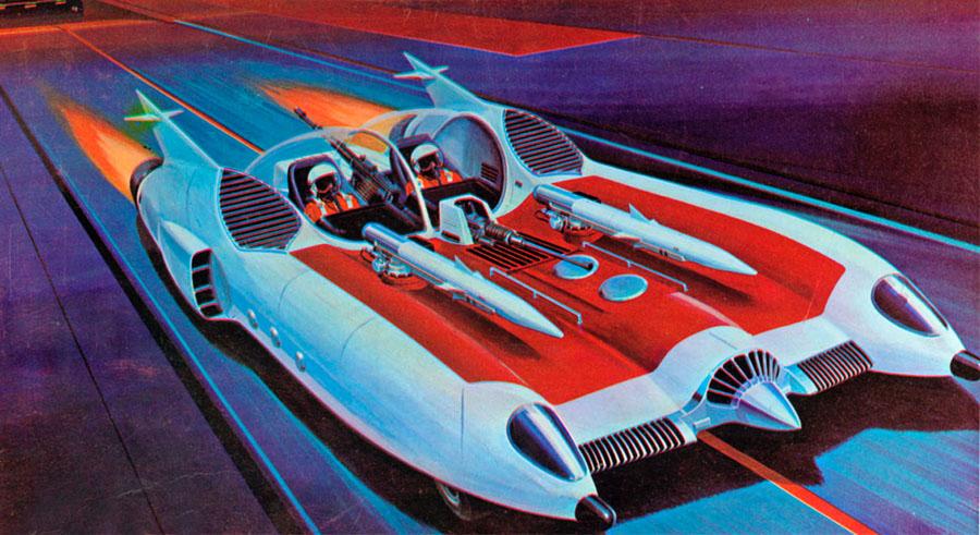 ” Space Patrol Car – Mahha ” . Cover art for a model kit . Manufactured by Otaki . Artist unknown . Classic Japanese retrofuturism from 1968 .