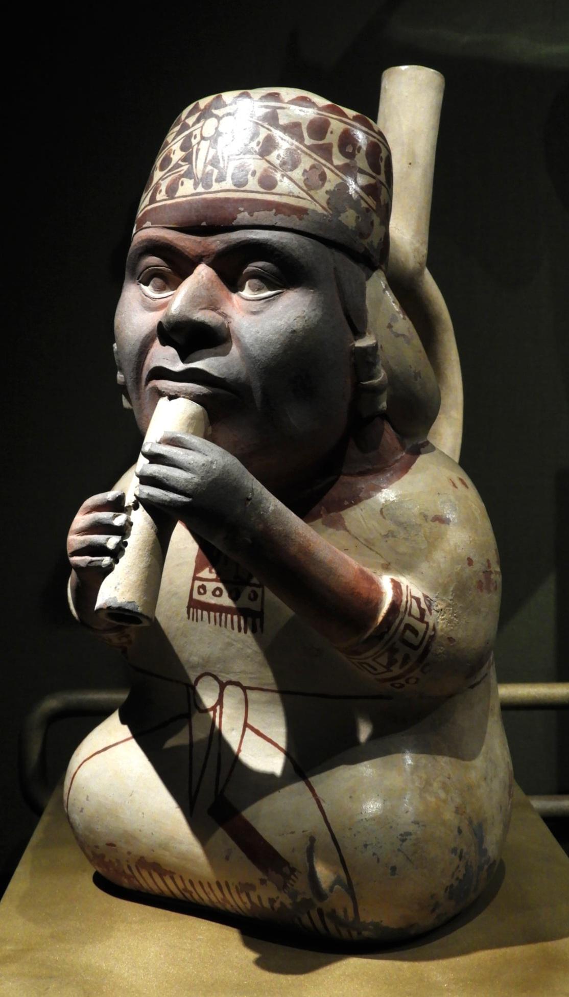 A Moche ceramic vessel in the form of a musician sitting cross legged playing a flute. From Peru, 200-600 CE, now housed at the British Museum [1114×1951]