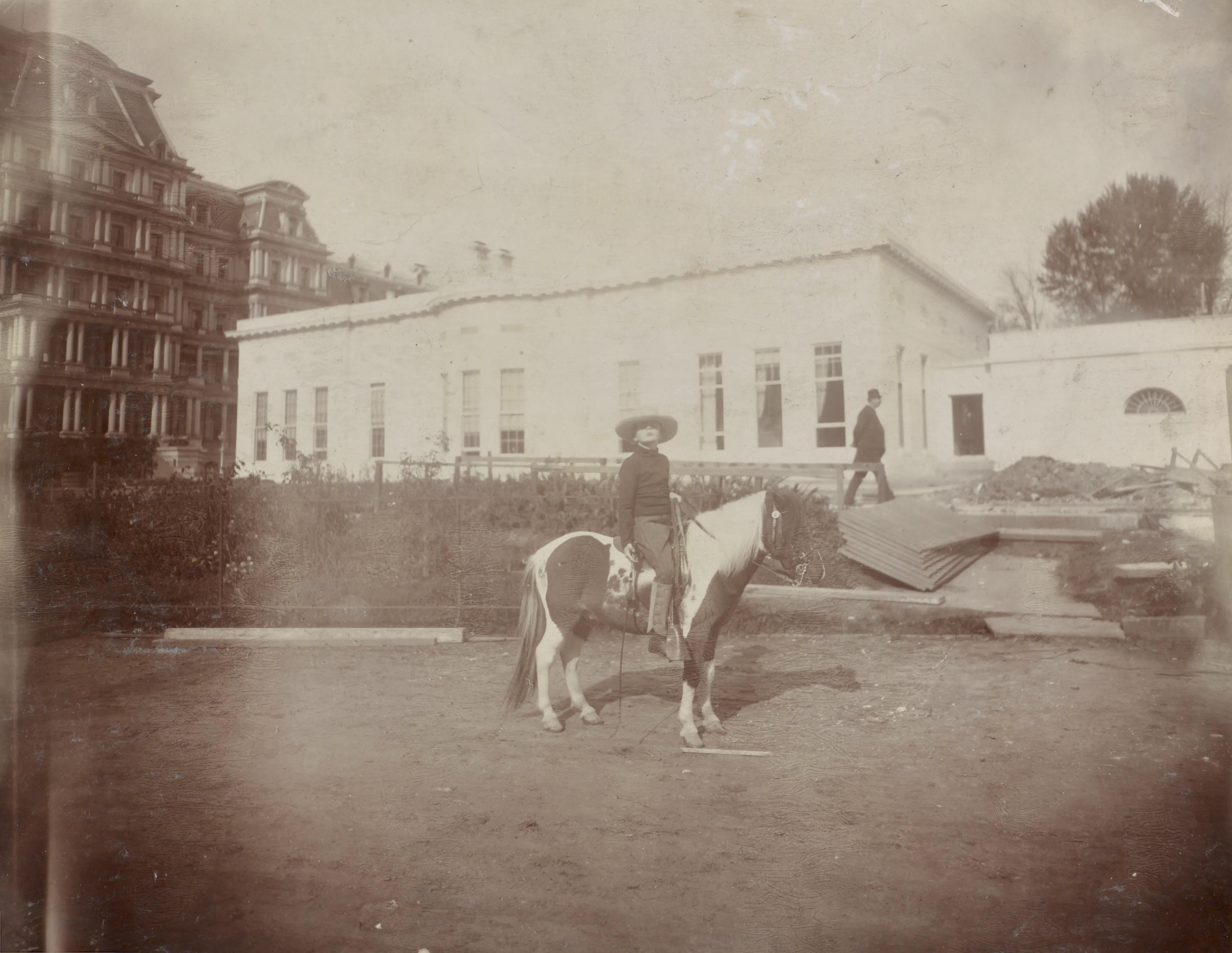 Archie Roosevelt in 1903, the son of President Theodore Roosevelt, riding ‘Algonquin’, his Shetland pony next to the West Wing of the White House. The oval office wasn’t built until later in 1909. [5632×4357]