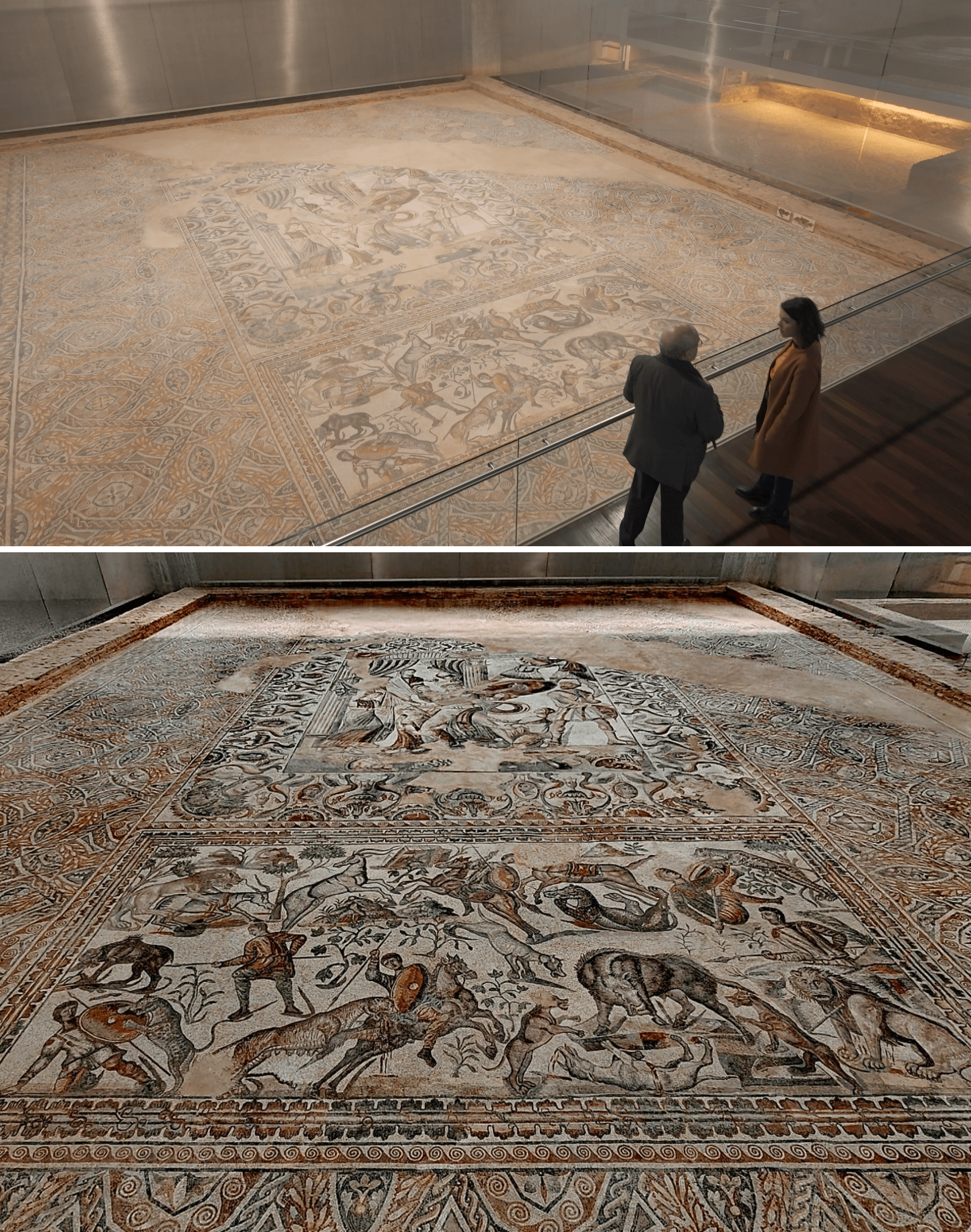 A large mosaic at the late antique Roman villa of La Olmeda, in Spain, depicting mythological and hunting scenes. 3rd-4th century CE [1920×2436]