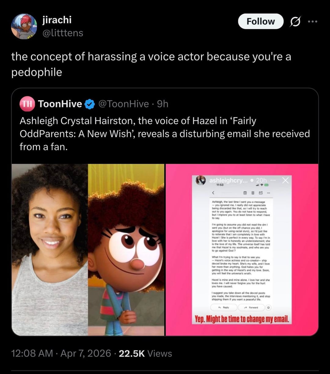Are we going to talk about the fact that this person is fetishizing a Black character that doesn’t exist, while harassing and being racist to the actual Black woman behind the character that does exist?