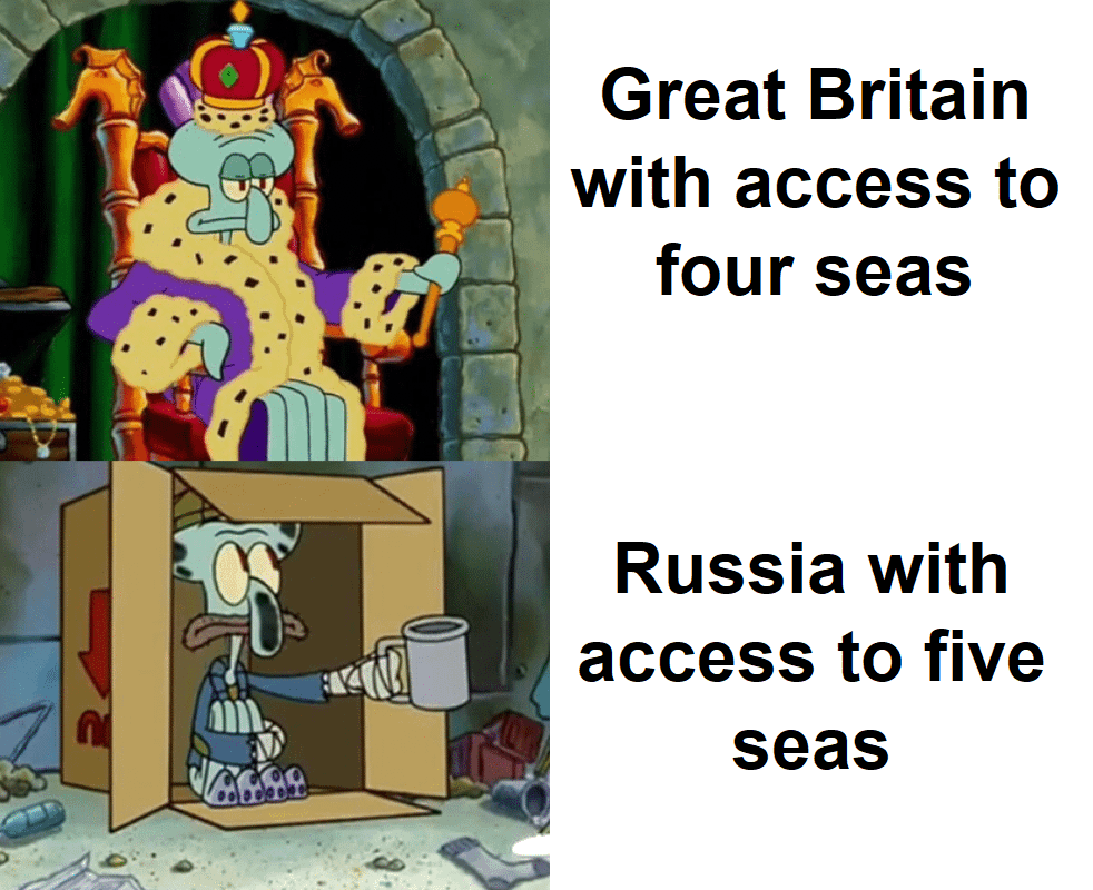 Everyone is acting like OP is calling Russia incompetent, but I think the point is that “5 seas” SOUNDS good on paper, but the 5 seas in question are actually shit. Russia has one of the longest coastlines in the world, but is practically landlocked militarily.