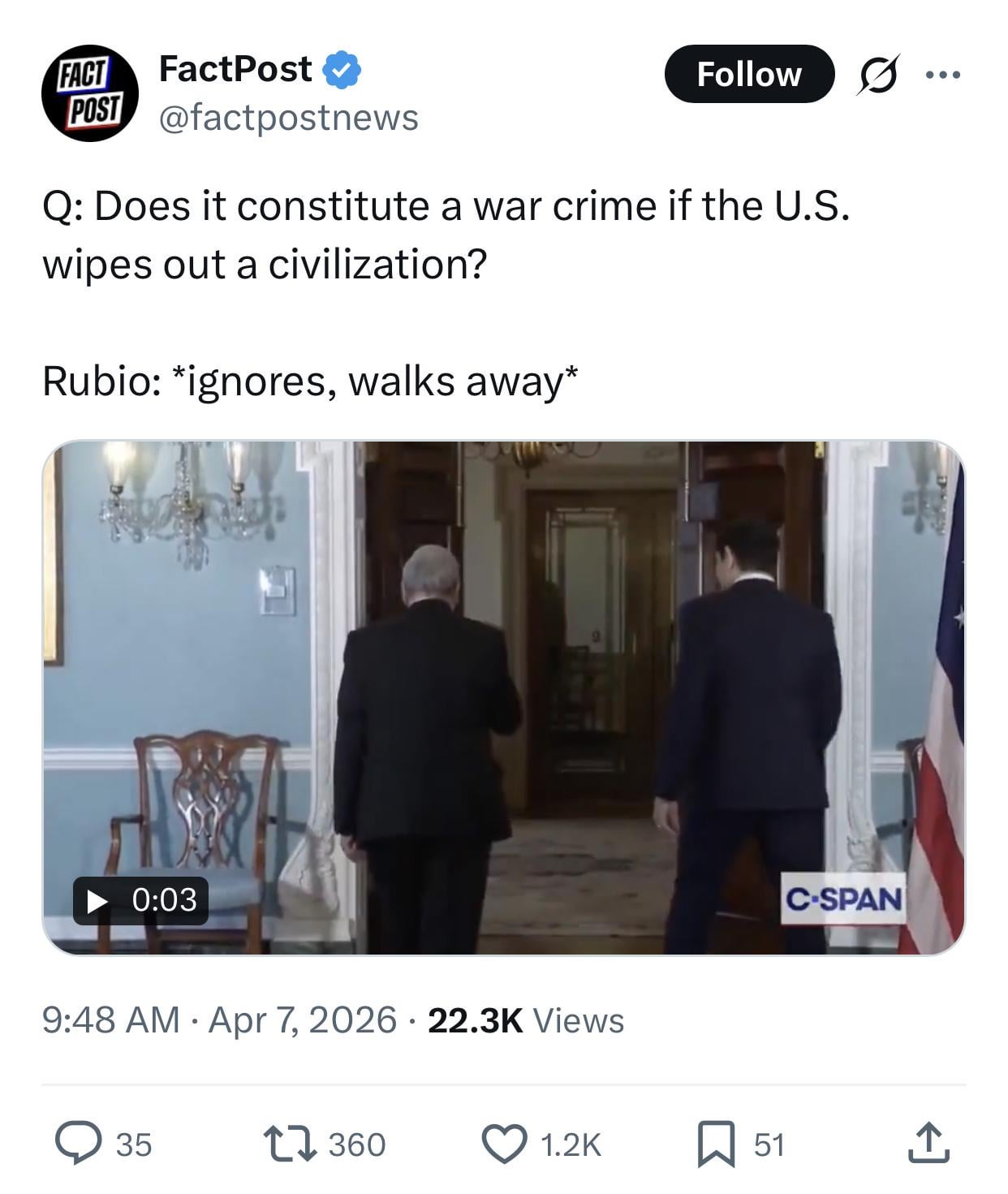 The Secretary of State is ignoring questions about committing war crimes. Hah…wow. Yeah good luck doing literally anything after Trump’s out.