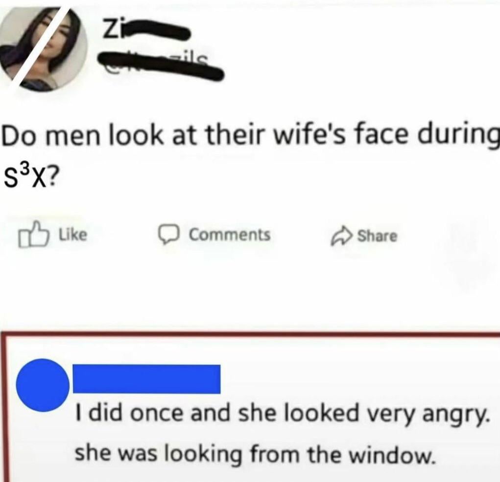 PSA if you do look at your wife’s face and her reactions during sex; don’t let her know because she will lock in and become a lifeless statue upon hearing how she looks.