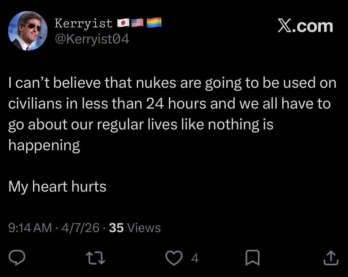 Why is this person so certain? What have I missed? I’m just trying to fucking work and not be online or watching the news and now we’re nuking shit for sure?!