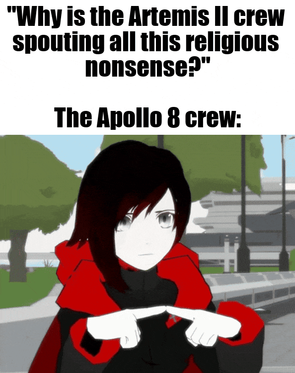 The Apollo 8 Genesis reading was a very fitting and wonderful thing to say at the witness of the first Earthrise. I know this is Reddit but it’s almost impossible to not see the beauty in it.
