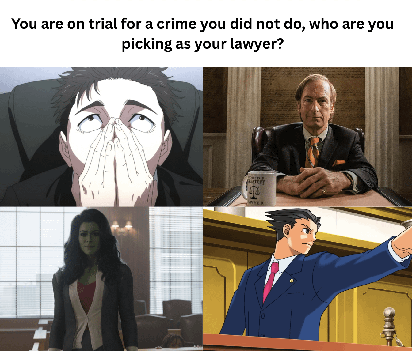 If i wanted to get pronounced guilty, id choose She-Hulk. Shed wouldnt even defend me, shed probably just tear up her notes, scream at me for being sad that im being acused of murder while she suffers so much more like catcalling and start twerking on the desk.