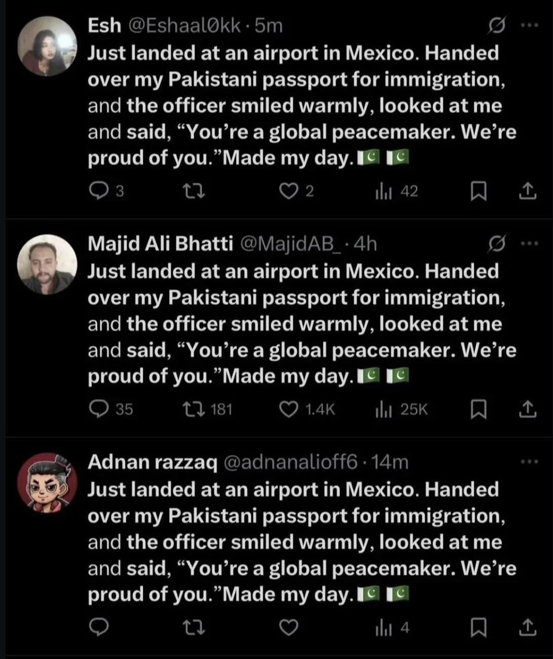 What a coincidence! I just landed at an airport in Mexico. Handed over my Pakistani passport for immigration, and the office smiled warmly, looked at me, and said, “You’re a global peacemaker. We’re proud of you.” Made my day.