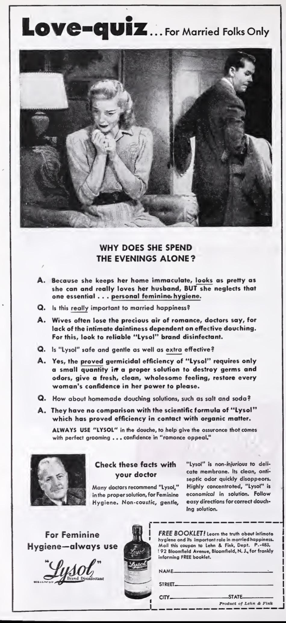 In case you didn’t know, [“feminine hygiene” was a euphemism for birth control](https://www.smithsonianmag.com/smart-news/lysols-vintage-ads-subtly-pushed-women-to-use-its-disinfectant-as-birth-control-218734/) back in the day. It wasn’t very effective and it did damage those “delicate membranes.”