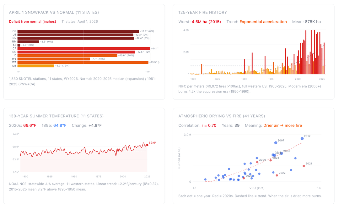Who is the intended audience for this? There is some editorializing that seems like this might be intended to communicate with policymakers, but you also say it can be used for resource pre-positioning or treatment prioritization (which would suggest land management agencies are the target). As a data person, it is frustrating to not see any sources for data.. I also see the word ‘research’ in a lot of places, but it seems clear that this is just digesting other publicly available data sources, right?