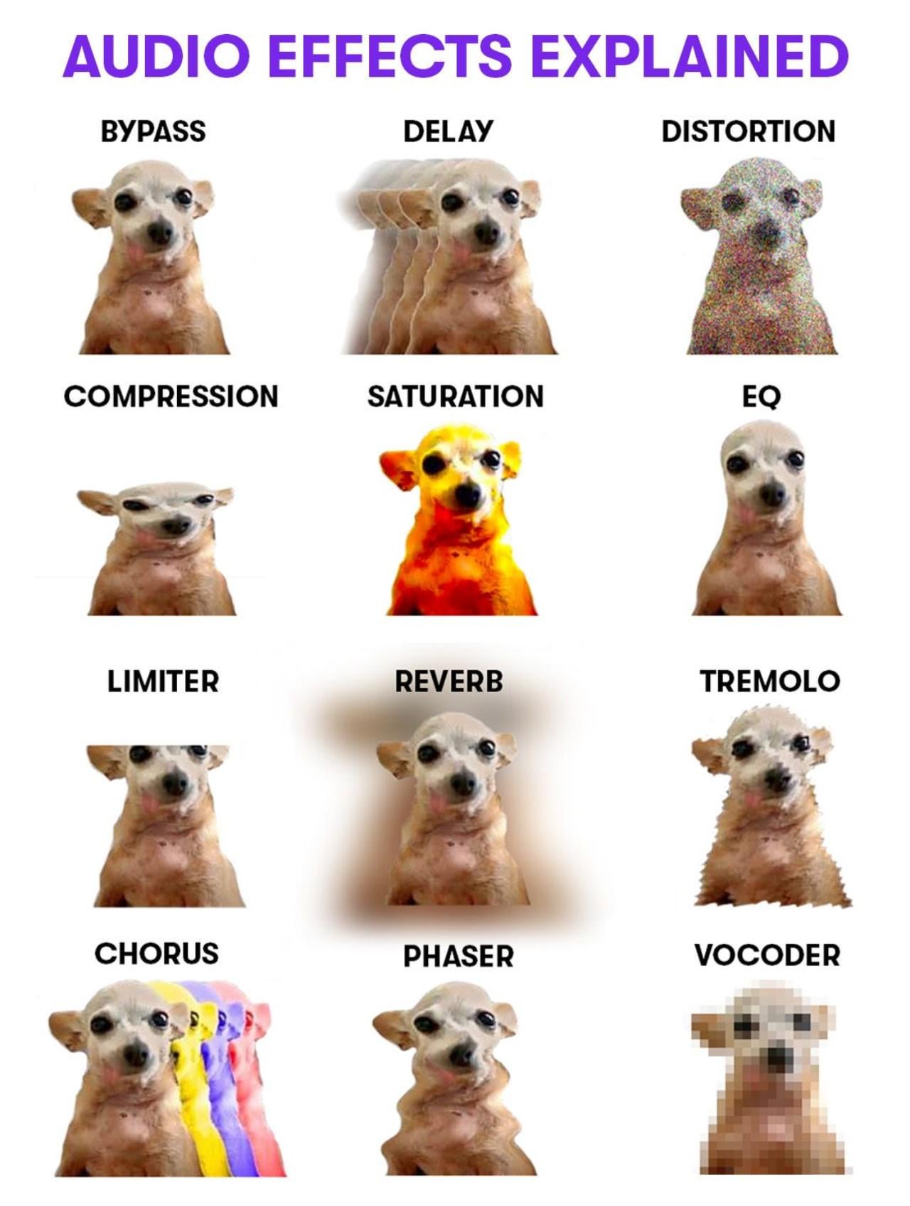 das_zilch on April 8, 2026 9:45 pm The image for limiter represents clipping. Limiters are compressors, albeit with very high ratios. Chorus would have several delays some closer and some further apart in a repeating wave-like patt… Oh, dank memes. Nevermind.