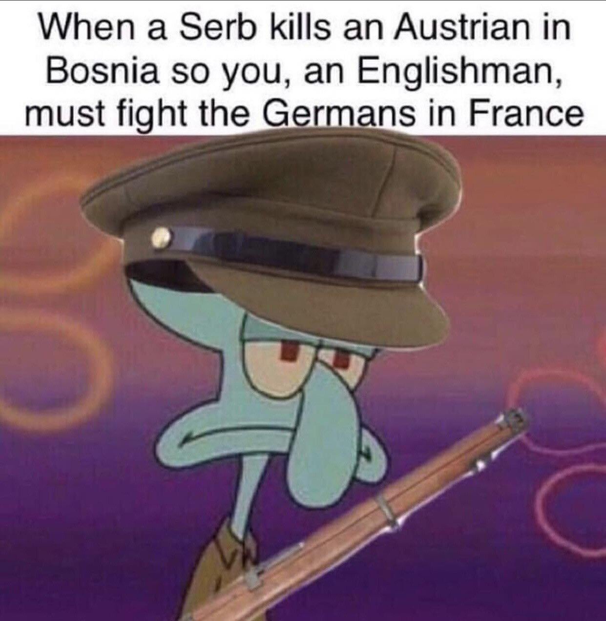 When Germany declared war on France because a Serb killed an Austrian in Bosnia so you, an Englishman, must fight the Hungarians in Belgium