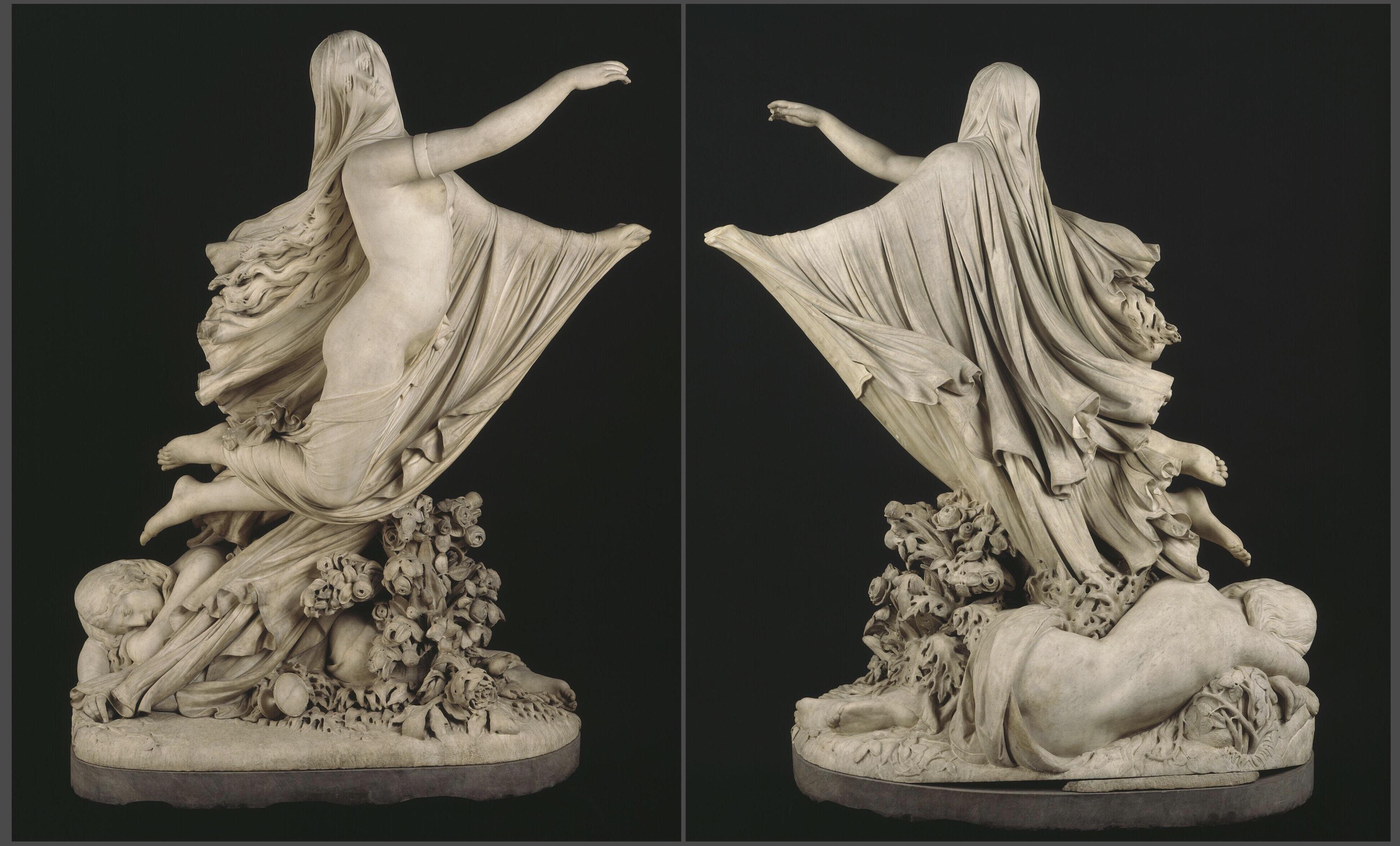 “Raffaelle Monti (1818-1881) carved this allegorical figure group in 1861, and it was shown in the International Exhibition in London in 1862. A veiled figure of the Dream of Joy appears to hover above the sleeping figure of Sorrow. Although an apparently lyrical group, and sculpturally highly accomplished, it was primarily a topical comment on the contemporary political situation and resurgence of cultural unity in Italy, where a kingdom was proclaimed on 17 March 1861.