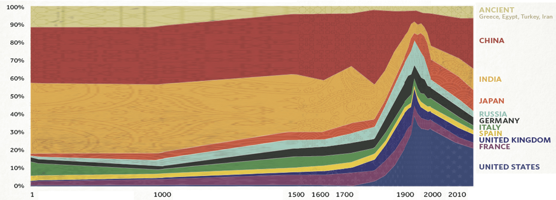 Great chart though. But I do wish we also had Netherlands and Portugal which were big powers around 16th 17th centuries. Also Turkey should’ve been its own category given the Ottoman power around 15th century. The chart gives too much weight in the past 300 years even though it begins all the way at year 1.