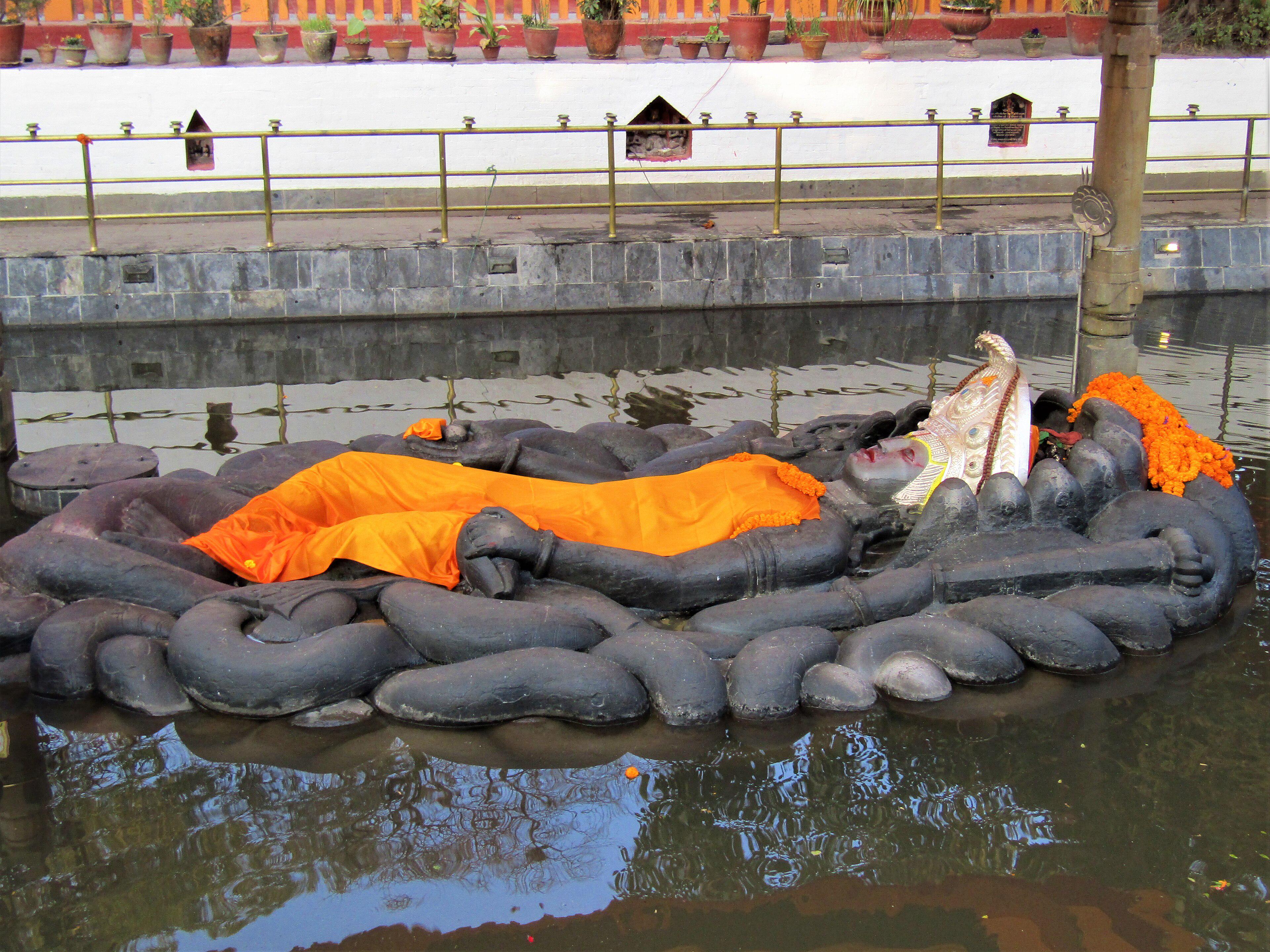 At least 1400 years old statue of Budhanilkantha in Nepal. Worshipped by Hindus as Vishnu and by Buddhists as Avalokiteshvara. The statue stands 5 meters tall (around 16.4 feet) and is positioned in the middle of a recessed pool of water, which is 13 meters (42.65 feet) long. [2880×2160]