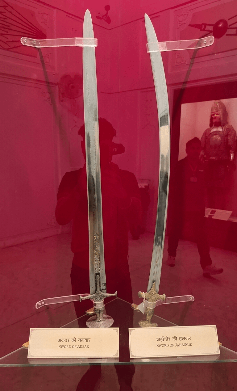 Straight Sword of 3rd mughal emperor akbar(15 October 1542 to 27 October 1605) and 4th jahangir( 31 August 1569 – 28 October 1627)curved sword,on display at alwar palace museum,india(768×1266)